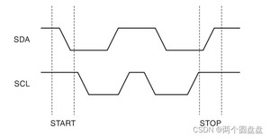 在空闲状态下,SCL及SDA都是置高的状态,当需要进行一次IIC传输时,由START信号指示当前数据传输开始,由STOP信号指示当前的数据传输结束,START信号的标识是在SCL高电平情况下,SDA信号由高变低 ,即视为START开始,STOP信号标识是在SCL高电平情况下,SDA信号由低变高,即视为STOP结束,START信号与STOP信号之间的信号流即为所传输信号。