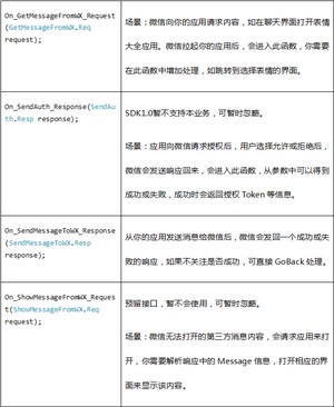 继承 WXEntryBasePage 类,并覆写下表中的函数,来处理来自微信的请求和响应,微信发送的数据,已经填到了参数中,可直接取用。注意:如果覆写 OnNavigatedTo 函数,需要调用 base.OnNavigatedTo,以保证父类中的逻辑得以执行。
