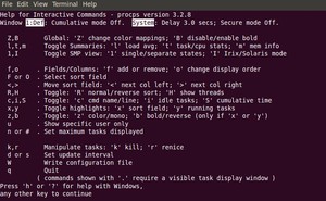s:改变两次刷新之间的延迟时间。系统将提示用户输入新的时间,单位为s。如果有小数,就换算成m s。输入0值则系统将不断刷新,默认值是5 s。需要注意的是如果设置太小的时间,很可能会引起不断刷新,从而根本来不及看清显示的情况,而且系统负载也会大大增加。