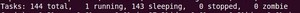 Tasks — 任务(进程),系统现在共有144个进程,其中处于运行中的有1个,143个在休眠(sleep),stoped状态的有0个,zombie状态(僵尸)的有0个。