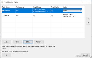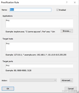 4.在第二步后点击OK,然后一直下一步,再点击Profile -> Proxification Rules ->add ->配置下面的各个选项,记得在最下面的Action中选择在2中添加的socks5代理服务器;