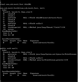 E:WorkspaceTestbincomcxh est2>javap -v Outter$Inner Compiled from "Outter.java" public class com.cxh.test2.Outter$Inner extends java.lang.Object SourceFile: "Outter.java" InnerClass: #24= #1 of #22; //Inner=class com/cxh/test2/Outter$Inner of class com/cxh/tes t2/Outter minor version: 0 major version: 50 Constant pool: const #1 = class #2; // com/cxh/test2/Outter$Inner const #2 = Asciz com/cxh/test2/Outter$Inner; const #3 = class #4; // java/lang/Object const #4 = Asciz java/lang/Object; const #5 = Asciz this$0; const #6 = Asciz Lcom/cxh/test2/Outter;; const #7 = Asciz <init>; const #8 = Asciz (Lcom/cxh/test2/Outter;)V; const #9 = Asciz Code; const #10 = Field #1.#11; // com/cxh/test2/Outter$Inner.this$0:Lcom/cxh/t est2/Outter; const #11 = NameAndType #5:#6;// this$0:Lcom/cxh/test2/Outter; const #12 = Method #3.#13; // java/lang/Object."<init>":()V const #13 = NameAndType #7:#14;// "<init>":()V const #14 = Asciz ()V; const #15 = Asciz LineNumberTable; const #16 = Asciz LocalVariableTable; const #17 = Asciz this; const #18 = Asciz Lcom/cxh/test2/Outter$Inner;; const #19 = Asciz SourceFile; const #20 = Asciz Outter.java; const #21 = Asciz InnerClasses; const #22 = class #23; // com/cxh/test2/Outter const #23 = Asciz com/cxh/test2/Outter; const #24 = Asciz Inner; { final com.cxh.test2.Outter this$0; public com.cxh.test2.Outter$Inner(com.cxh.test2.Outter); Code: Stack=2, Locals=2, Args_size=2 0: aload_0 1: aload_1 2: putfield #10; //Field this$0:Lcom/cxh/test2/Outter; 5: aload_0 6: invokespecial #12; //Method java/lang/Object."<init>":()V 9: return LineNumberTable: line 16: 0 line 18: 9 LocalVariableTable: Start Length Slot Name Signature 0 10 0 this Lcom/cxh/test2/Outter$Inner; }