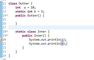 public class Test { public static void main(String[] args) { Outter.Inner inner = new Outter.Inner(); } } class Outter { public Outter() { } static class Inner { public Inner() { } } }