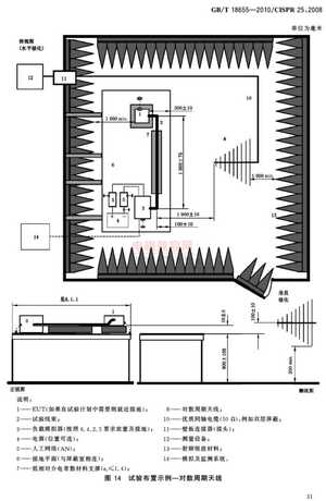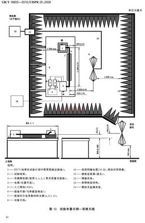 辐射发射测试的线束长一般要求 1.7m~2m。蓄电池和负载箱之间会用 AN 即人工网络。AN 可以阻止 EUT 产生的射频电磁骚扰进入电网,同时衰减来自电网的干扰信号。测试频段一般为 150kHz~2.5GHz,根据测试频段的不同天线也会不一样,一般按下列要求准备天线:(上面4个图,就是4条天线的测试布置情况)
