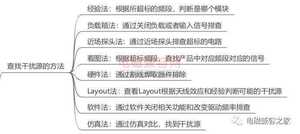 如果你是一个新手,既没有什么 EMC 经验,对产品又不熟悉,你也不要绝望,老老实实的按图中的其他方法来查,你也一样可以找到问题。负载箱法其实是一种排除法。通过关闭不同的负载和输出信号,使怀疑的模块不工作来一个个排查,这种方法虽然很土,但只要你有耐心,总能找到干扰源。当然这种方法只适合于干扰源是输入模块和输出模块。如果是晶振,电源 Buck 这样的内部模块,该方法不太好用,可以考虑近场探头法。近场探头法是指通过频谱分析仪的进场探头在被测产品上一个区域一个区域的排查。如果对应的频段近场探头测到的干扰比较大,很有可能辐射发射的超标也与之有关。当然这种方法对于带外壳的产品需要开盖,具有一定的局限性,但特别适合于控制器等产品。看图法和 Layout 法是需要有一定的 EMC 经验和 EMC 常识的,要不你也看不出什么名堂。硬件法和软件法也是属于排除法,不需要有多少经验,但需要耐得住寂寞,沉得住气。而仿真法对工程师的要求比较高,需要有一定的仿真积累,要不不知道从何开始建模。通过下面的一些方法,大家肯定就可以找到干扰源和耦合路径。