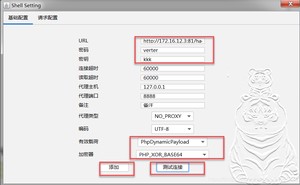 ④ 目标 → 基础配置 → 将框选的内容填写修改 有效载荷和加密器 点击 测试连接 连接成功后点击添加。