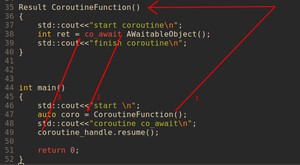 - 一旦协程被恢复运行时,继续调用await_resume()在返回一个值到协程挂起点,如例子所示