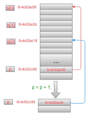 在执行操作后,p需要跨过的空间是一个结构体变量在内存中占据的大小(12个字节),所以此时p就指向了数组中第2个元素的首地址,内存模型如下: