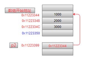 第2条语句中:小括号让p2与*结合,表示p2是一个指针,这个指针指向了一个数组,数组中有3个元素,每一个元素的类型是int型。可以这样来理解:如果有这个定义,很容易理解这是一个有3个char型元素的数组,那么把数组名p换成是*p2,也就是p2是一个指针,指向了这个数组。内存模型如下(注意:指针指向的地址是一个数组,其中的3个元素是连续放在内存中的):
