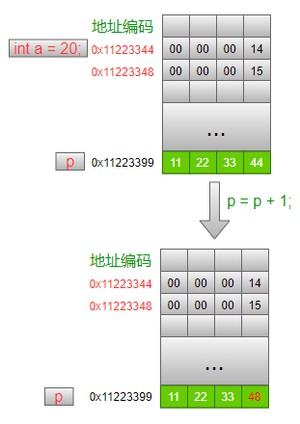 假如一个指针指向的数据类型为int型,那么执行之后,指针p中存储的地址值将会增加4,因为一个int型数据在内存中占据4个字节的空间,如下所示: