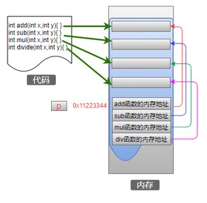 这条语句不太好理解:,先分析中间部分,标识符p与中括号[]结合(优先级高),所以p是一个数组,数组中有4个元素;然后剩下的内容表示一个函数指针,那么就说明数组中的元素类型是函数指针,也就是其他函数的地址,内存模型如下: