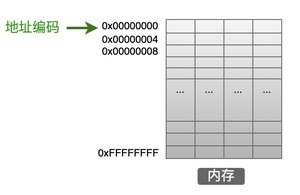 内存中的最小存储单位是字节(8个bit),一个内存的完整空间就是由这一个一个的字节连续组成的。在上图中,每一个小格子代表一个字节,但是好像大家在书籍中没有这么来画内存模型的,更常见的是下面这样的画法:
