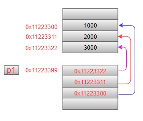 第1条语句中:中括号[]的优先级高,因此与p1先结合,表示一个数组,这个数组中有3个元素,这3个元素都是指针,它们指向的是int型数据。可以这样来理解:如果有这个定义,很容易理解这是一个有3个char型元素的数组,那么把char换成int*,意味着数组里的元素类型是int*型(指向int型数据的指针)。内存模型如下(注意:三个指针指向的地址并不一定是连续的):