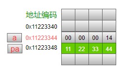 这个例子中说明了一个重要的概念:在内存中一切都是数字,如何来操作(解释)一个内存地址中的数据,完全是由我们的代码来告诉编译器的。刚才这个例子中,虽然0x这个地址开始的4个字节的空间中,存储的是整型变量a的值,但是我们让pc指针按照char型数据来使用/解释这个地址处的内容,这是完全合法的。