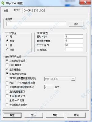 运行程序,在软件主界面单击“设置”按钮,弹出“Tftp64:设置”窗口,可以自定义对TFTP安全性以及高级选项进行相应的勾选配置;