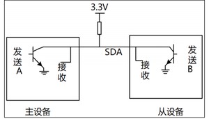 - 开漏电路(Open-Drain):设备的 SDA 引脚接入三极管,并采用开漏配置(或 CMOS 管的开极配置),可以通过三极管的导通与否控制 SDA 线的电平。具体控制机制如下: