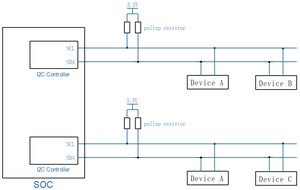 - I2C 控制器:通常嵌入在 SoC(系统级芯片)内部,管理 I2C 通信协议。一个 SoC 可以包含多个 I2C 控制器。