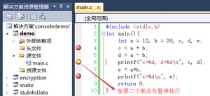 在调试过程中,按照上面的方法可以设置多个断点,程序在执行过程中每次遇到断点都会暂停,如下图所示: