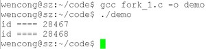 从运行结果,我们可以看出,fork() 之后的打印函数打印了两次,而且打印了两个进程号,这说明,fork() 之后确实创建了一个新的进程,新进程为子进程,原来的进程为父进程。