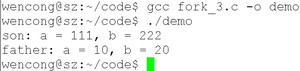 通过得知,在子进程修改变量 a,b 的值,并不影响到父进程 a,b 的值。