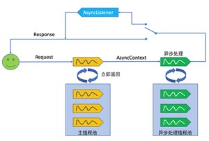 Tomcat的工作线程会将当前的request,response对象的引用放入AsyncContext中,并将AsyncContext交付给一个新的线程处理,保持response的打开状态,然后立即返回Tomcat工作线程池等待处理其他的请求。