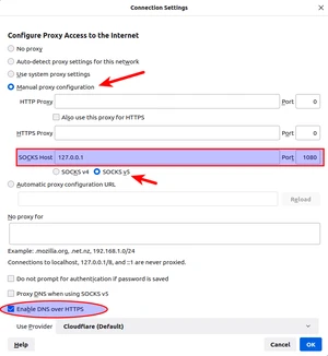 - 您可以在使用 SOCKS v5 时启用代理 DNS,或启用通过 HTTPS 的 DNS。两者都很好。