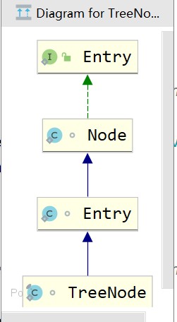 Map接口中有一个Entry接口,在HashMap中对其进行了实现,Entry的实现是HashMap存放的数据的类型。其中Entry在HashMap的实现是Node,Node是一个单链表的结构,TreeNode是其子类,是一个红黑树的类型,其继承结构图如下: