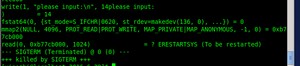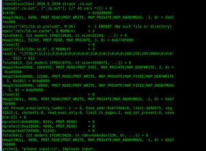 从trace结构可以看到,系统首先调用execve开始一个新的进行,接着进行些环境的初始化操作,最后停顿在”read(0,”上面,这也就是执行到了我们的scanf函数,等待我们输入数字呢,在输入完99之后,在调用write函数将格式化后的数值" 2″输出到屏幕,最后调用exit_group退出进行,完成整个程序的执行过程。