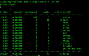 strace不光能追踪系统调用,通过使用参数-c,它还能将进程所有的系统调用做一个统计分析给你,下面就来看看strace的统计,这次我们执行带-c参数的strace: