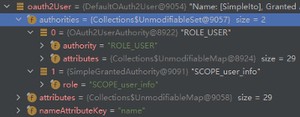 - 经过上述认证后拿到填充了 "access_token" 的,会构造成后传给负责进行实际的 "user-info-uri" 请求,并将结果包装成返回。(该User拥有两类authorities,一个是ROLE_USER(Spring在经过oauth2UserService时手动添加的),一类是Token中的SCOPE_{sopces})