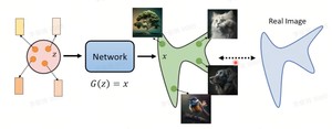 如下图所示,从一个分布z中采样一个vector出来,通过网络,生成一张图片;所有采样到的vector生成的图片可以得到一个分布。目的是学习到这个网络,使生成图像的分布和真实图像分布接近。