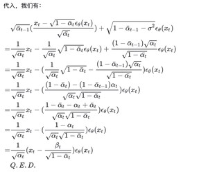 $x_{t-1} = sqrt{baralpha_{t-1}}(frac{x_t-sqrt{1-baralpha_t}epsilon_ heta(x_t)}{sqrt{baralpha_t}})+sqrt{1-baralpha_{t-1}-sigma^2}epsilon_ heta(x_t)+sigmaepsilon$