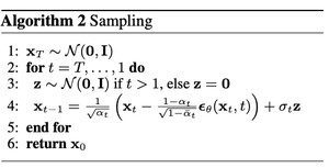 之后从 $t=T$一直到 $t=1$重复 $T$步,每一步首先从高斯分布采样一个噪声 $z$,之后将 $x_t$和时间步 $t$送入噪声预测模型预测出噪声 $epsilon_ heta$,根据预测的噪声和图像 $x_t$以及采样的噪声 $z$用公式求出 $x_{t-1}$。