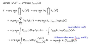从分布 $z$中采样vector,送入网络 $ heta$产生 $x$,可以得到一个分布 $P_ heta(x)$。真实的训练数据集的分布是 $P_{data}(x)$,从真实的分布中采样 $x^1,x^2,..,x^m$,目的是让从学习到的分布 $P_ heta(x)$产生 $x^i$的概率最大。$P_ heta(x^i)$即分布 $P_ heta$产生 $x^i$的概率。