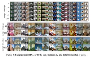 当方差为0时,生成过程是确定的,只受 $x_T$影响。给定不同的 $x_T$,不同的采样步数下生成的图片都是类似的, $x_T$可以看作生成图片的隐编码信息。(在实际生成图片时可以控制 $x_T$不变,设置较小的采样步数,若生成的图片是想要的,再用更大的步数生成更精细的图片)。