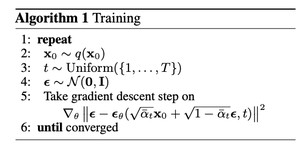 具体来看,首先从图像数据集分布 $q(x_0)$中采样样本 $x_0$,从自然数集合中采样时间步 $t$,从高斯分布中采样噪声 $epsilon$(大小和image相同)。生成添加噪声的新样本图$x_1 = sqrt{baralpha_t}x_0+sqrt{1-baralpha_t} epsilon$。将新样本图和时间步 $t$送入噪声预测模型中,模型预测出噪声 $epsilon_ heta$,预测的噪声和真实的噪声求损失,来更新模型参数。重复上述步骤直至收敛。