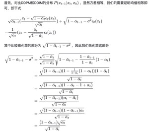 因此, $P(x_{t-1}|x_t,x_0)=N(sqrt{baralpha_{t-1}}x_0+sqrt{1-baralpha_{t-1}-sigma^2}frac{x_t-sqrt{baralpha_t}x_0}{sqrt{1-baralpha_t}},sigma^2I)$