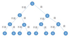 首先对于每个物品,我们的选择只有两个:放或者不放。我们将所有的可能都穷举出来,就可以得到下面这个树状图(只画了前四个结点):