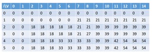 对于动态规划通常我们会用自底向上的方法,而递归是自顶向下的。自底向上的意思就是我们从子问题$F(0, 0)$一直计算到$F(5, 14)$,我们知道要计算$F(5, 14)$,得先解决它前面的子问题,但由于是自底向上的,所以我们并不知道$F(5, 14)$的子问题有哪些,因此我们只能够把它所有可能的子问题都找出来,即$F(4, V), (V in (0, 1, 2, 3......14))$,而$F(5, 14)$的子问题一定是包含在内的,比如$F(5, 14)$的子问题就是$F(4, 14)$和$F(4, 14-c_5)$。所以自顶向下的过程就相当于在填这个表: