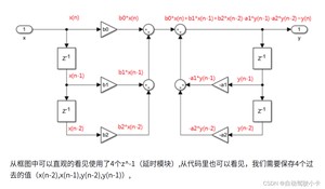 系数有了那这样的差分方程怎么写成代码呢?转换成差分方程后,下标n就代表当前值,下标n-1代表这个数是上个周期的值,n-2代表这个数延时了两周期。