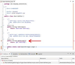 上面是该程序在 eclipse 中的截图。从中,我们可以发现 "getString()" 函数会报错。这是因为 "getString() 被 @Override 所标注,但在OverrideTest 的任何父类中都没有定义 getString1() 函数"。