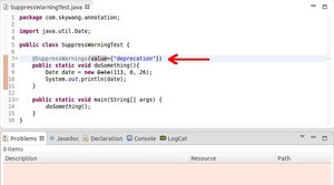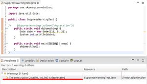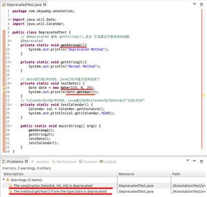 (01) 左边的图中,没有使用 @SuppressWarnings(value={"deprecation"}) , 而 Date 属于 java 不再建议使用的类。因此,调用 Date 的 API 时,会产生警告。而右边的途中,使用了 @SuppressWarnings(value={"deprecation"})。因此,编译器对"调用 Date 的 API 产生的警告"保持沉默。