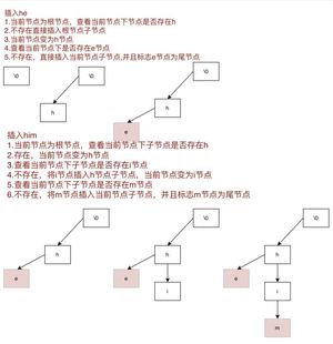 将需要加入的模式串加入Tire树,遍历当前字符串字符,从Tire树根节点开始查找当前字符,如果字符已经存在不需要处理,并且从这个字符节点出发,查看下一个字符是否存在,如果当前节点不存Tire树,才需要插入当前字符,当插入最后一个字符时需要标志当前字符节点为尾节点。