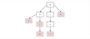 我们先看看Tire树长什么样子,以单纯的单词匹配为例,首先它是一棵多叉树结构,根节点是一个空字符,树中节点分为普通节点和结尾节点(如图中红色节点)。结尾节点表示加上前面前缀,可以称为一个单词,如图中hi,him。