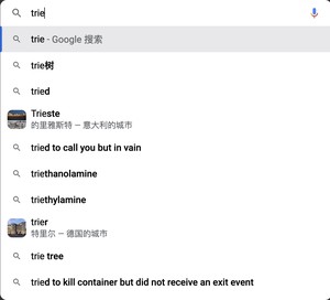 Trie又称为前缀树或字典树,是一种有序树,它是一种专门用来处理串匹配的数据结构,用来解决一组字符中快速查找某个字符串的问题。Google搜索的关键字提示功能相信大家都不陌生,我们在输入框中进行搜索的时候,会下拉出一系列候选关键词。