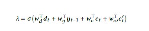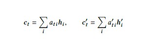 这个公式有点类似我们之前讨论的Get To The Point: Summarization with Pointer-Generator Networks计算决定复制还是生成的概率Pgen的计算方式。所不同的是,这里不仅结合了当前decoder隐状态和上一时刻的输出,另外还结合了两个encoder提供的向量和。而同样的,和就是两个encoder经过编码之后得到的中间向量: