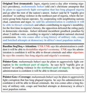在这张图中,基础的seq2seq模型的预测结果存在许多谬误的句子,同时如nigeria这样的单词反复出现(红色部分)。这也就印证了作者提出的基础seq2seq在文本摘要时存在的问题;Pointer-Generator模型,也就是在seq2seq基础上加上Pointer Networks的模型基本可以做到不出现事实性的错误,但是重复预测句子的问题仍然存在(绿色部分);最后,在Pointer-Generator模型上增加Coverage机制,可以看出,这次模型预测出的摘要不仅做到了事实正确,同时避免了重复某些句子的问题(摘要结果来自原文中的蓝色部分)。