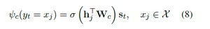 这三个公式类似之前提到的传统seq2seq模型中的attention过程,其中hi是source encoder的隐状态,dt是decoder的隐状态,而hj’则是knowledge encoder的隐状态,最后分别得到针对商品标题和knowledge的概率分布:和。