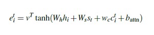 这个公式其实是对传统Attention公式的调整,也就是在结合encoder隐状态和decoder隐状态的基础上又加入了coverage vector的信息,这样就把coverage信息结合了进去。