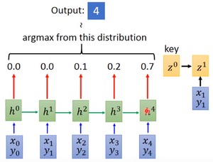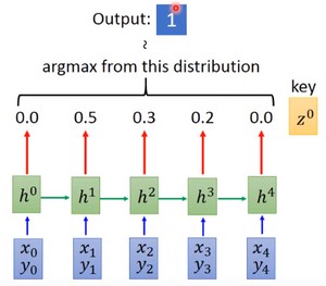 先有一个,然后用和所有的点做attention 操作,不同的是,得到的结果不做加权求和,而是直接做归一化,然后去概率最大的那个。例如,上图中1号点概率为0.5最大。然后把1号点作为输入生成,然后做attention并求分布最大值,得到4号点